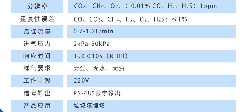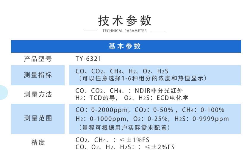 CO2、CH4、:≤±1%FS;CO、O2、H2、H2S::≤±2%FS |
