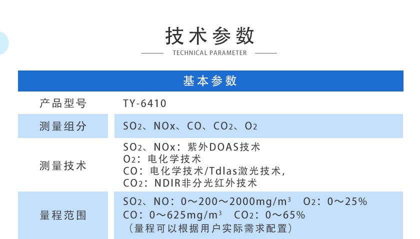 SO2、NOx:紫外DOAS技術(shù);O2:電化學(xué)技術(shù);CO:電化學(xué)技術(shù)/Tdlas激光技術(shù);CO2:NDIR非分光紅外技術(shù) |