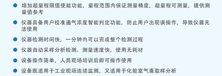 SO2、NO、NO2:0~100mg/m3;O2:0~25%;CO:0~100mg/m3;CO2:0~50%;(量程可以根據用戶實際需求配置)