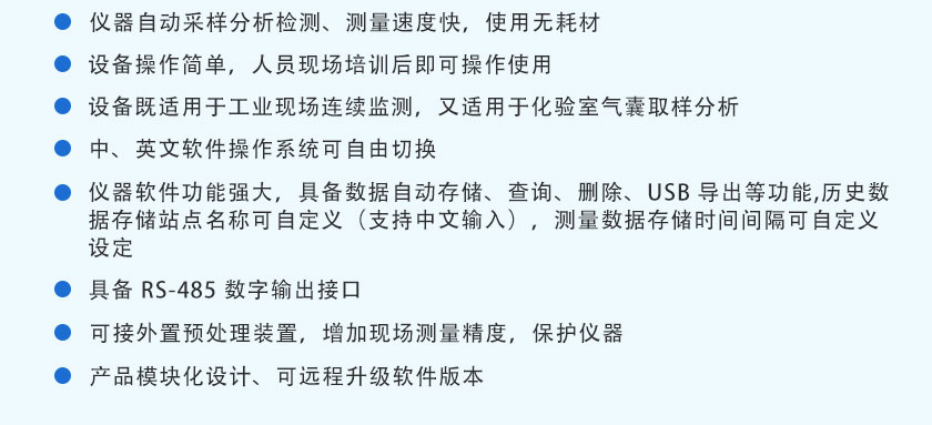 該分析儀基于紫外差分吸收光譜技術(DOAS)和化學計量學算法(PLS),能夠測量SO2、NO、NO2、O2、NH3、CO、CO2、Cl2、O3、H2S、HCl、CH3I等氣體濃度,具有測量精度高、可靠性強、運行成本低、響應時間快、量程跨度大、應用范圍廣等特點。
