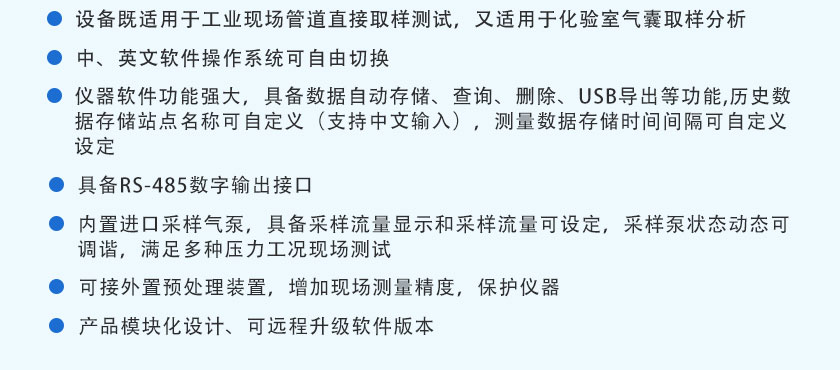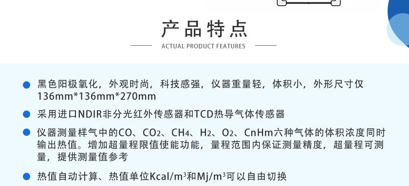 CO、CO2、CH4、CnHm :NDIR非分光紅外;H2:TCD熱導, O2:ECD電化學 |