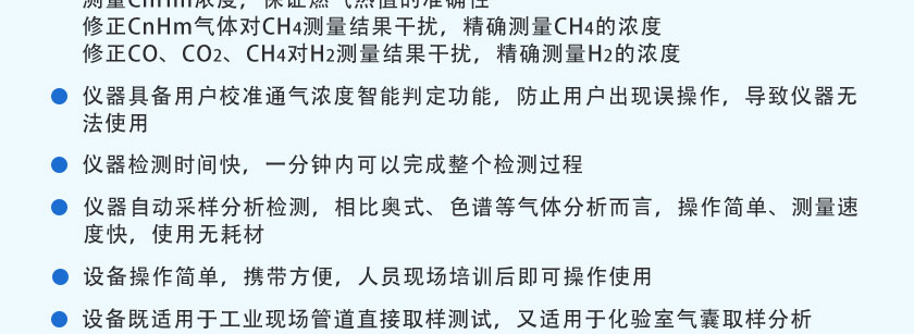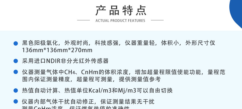 紅外煤氣成分及熱值分析儀采用進(jìn)口NDIR非分光紅外傳感器,長(zhǎng)壽命電化學(xué)傳感器和基于MEMS的熱導(dǎo)傳感器,運(yùn)用先進(jìn)的數(shù)字處理技術(shù),可同時(shí)在線測(cè)量煤氣、生物燃?xì)庵蠧O、CO2、CH4、H2、O2、CnHm等六種氣體的體積濃度,根據(jù)氣體濃度值快速準(zhǔn)確計(jì)算出相應(yīng)的熱值。