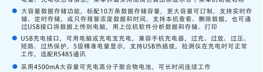 CO(0.1ppm)、H2S(0.01ppm)、O2(0.01%Vol)、Ex(0.1%LEL)、CO2(1ppm)、NOX(0.1ppm),分辨率可訂制1ppm(0~1000 ppm以上),0.1%LEL(0~100%LEL)、0.01%Vol或0.001%Vol(0~99.999%Vol)