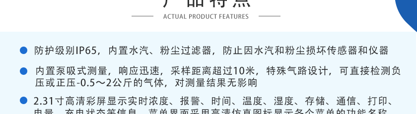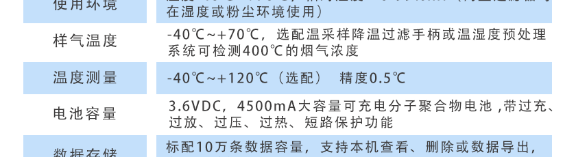 -40℃~+70℃ ,選配高溫采樣降溫過濾手柄,可檢測400度或更高溫度的煙氣濃度