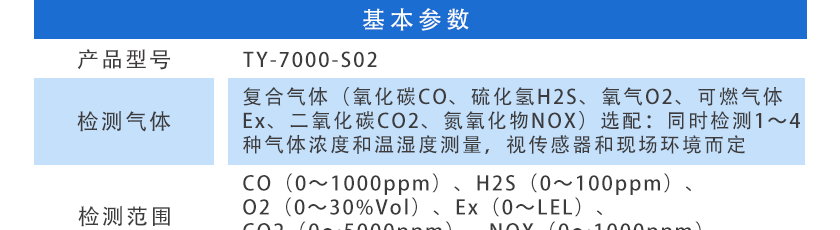 CO(0~1000ppm)、H2S(0~100ppm)、O2(0~30%Vol)、Ex(0~LEL)、CO2(0~5000ppm)、NOX(0~1000ppm),其他量程可訂制
