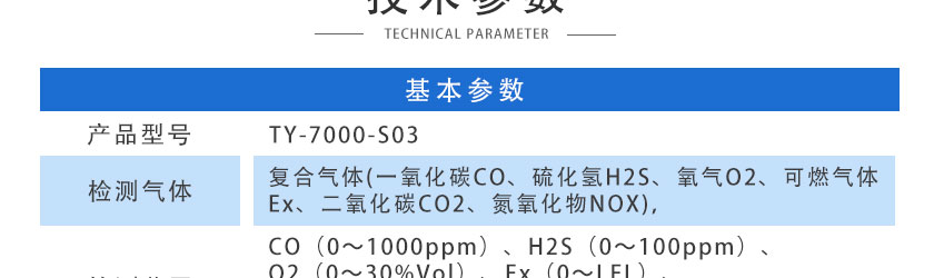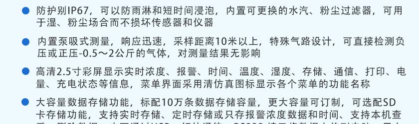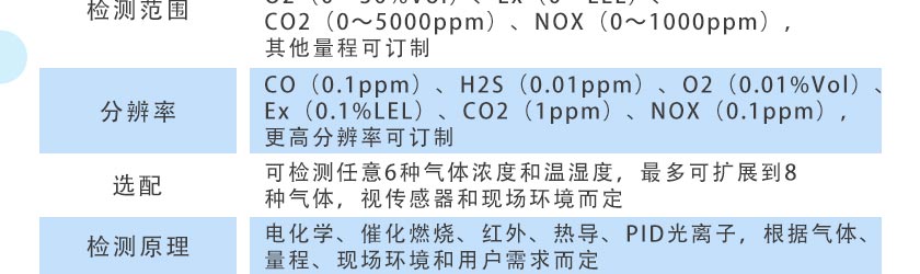 CO(0~1000ppm)、H2S(0~100ppm)、O2(0~30%Vol)、Ex(0~100%LEL)、CO2(0~5000ppm)、NOX(0~1000ppm),其他量程可訂制 |