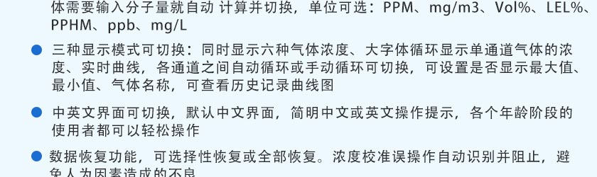 可檢測任意6種氣體濃度和溫濕度,最多可擴展到8種氣體,視傳感器和現場環境而定 |