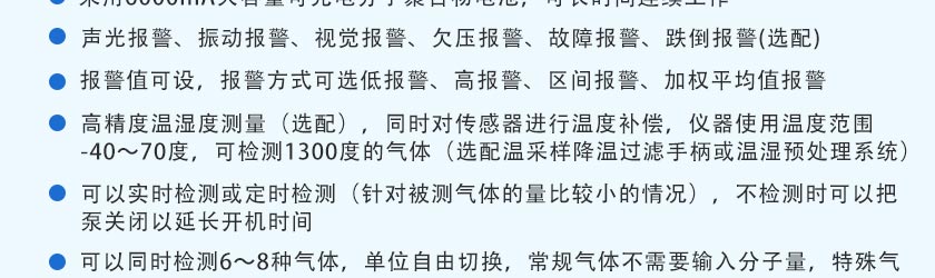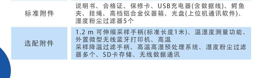 1.2m可伸縮采樣手柄(標準長度1米)、溫濕度測量功能、外置微型無線藍牙打印機、高溫采樣降溫過濾手柄、高溫高濕預處理系統、濕度粉塵過濾器多個、SD卡存儲、無線數據通訊 |