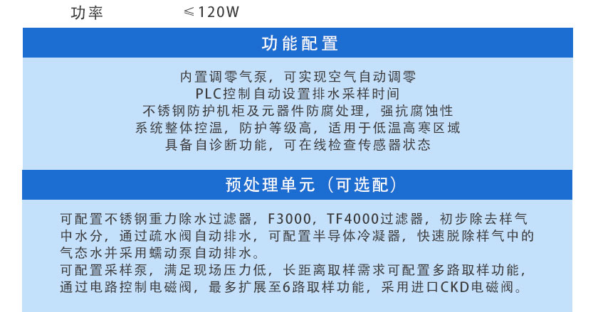 可配置采樣泵,滿足現場壓力低,長距離取樣需求可配置多路取樣功能,通過電路控制電磁閥,最多擴展至6路取樣功能,采用進口CKD電磁閥。