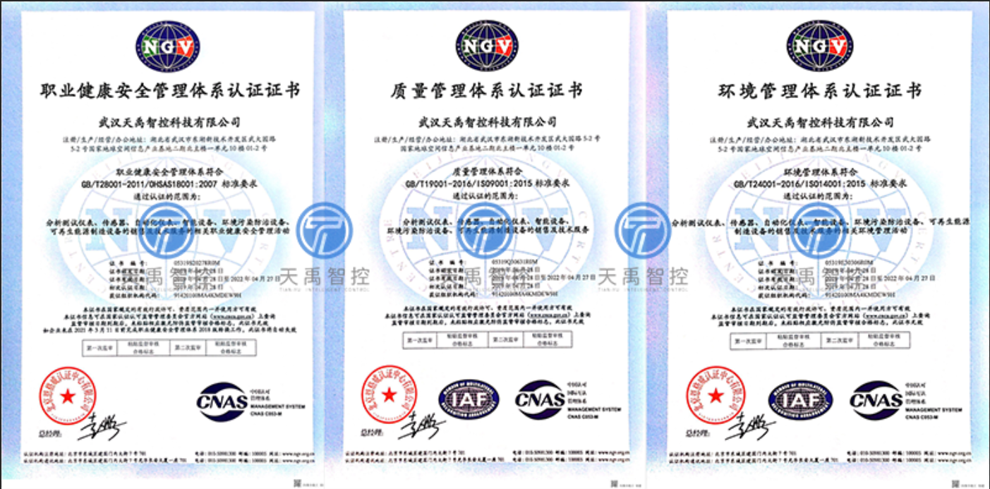 2019年4月29日,天禹智控獲得了ISO9001質(zhì)量管理體系認(rèn)證證書、ISO14001環(huán)境管理體系認(rèn)證、OHSAS18001職業(yè)健康安全管理體系認(rèn)證證書。據(jù)了解, ISO9001標(biāo)準(zhǔn)是許多經(jīng)濟發(fā)達國家實施質(zhì)量管理的經(jīng)驗總結(jié)。ISO14001環(huán)境管理體系標(biāo)準(zhǔn)是創(chuàng)建綠色企業(yè)的有效工具,對企業(yè)持續(xù)地開展環(huán)境管理工作及對企業(yè)的可持續(xù)發(fā)展起到有效地推動作用。OHSAS18001該標(biāo)準(zhǔn)為各類組織提供了結(jié)構(gòu)化的運行機制,幫助組織改善安全生產(chǎn)管理,推動職業(yè)健康安全和持續(xù)改進。它們具有普遍性、通用性和指導(dǎo)性。