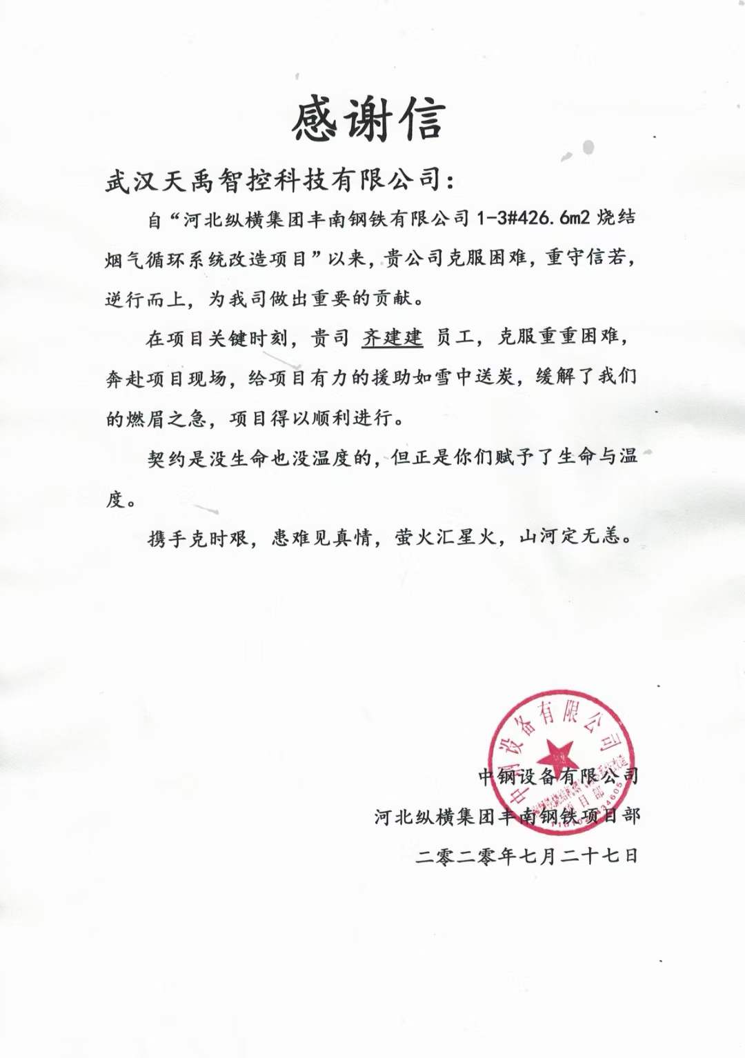 今年,在新冠肺炎疫情防控的戰場上,全國上下團結一致、同心協力!為配合客戶項目關鍵工作的穩定進行,天禹智控與客戶攜手克艱,為緊急項目貢獻力量。客戶對天禹智控的專業與敬業贊嘆不已,特發來感謝信以感謝突出貢獻。