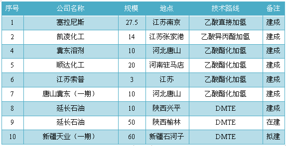 煤經(jīng)合成氣制乙醇項目在國內(nèi)發(fā)展較快,目前已經(jīng)建成產(chǎn)能94.5萬噸,在建和擬建產(chǎn)能達110萬噸,總產(chǎn)能達204.5萬噸。