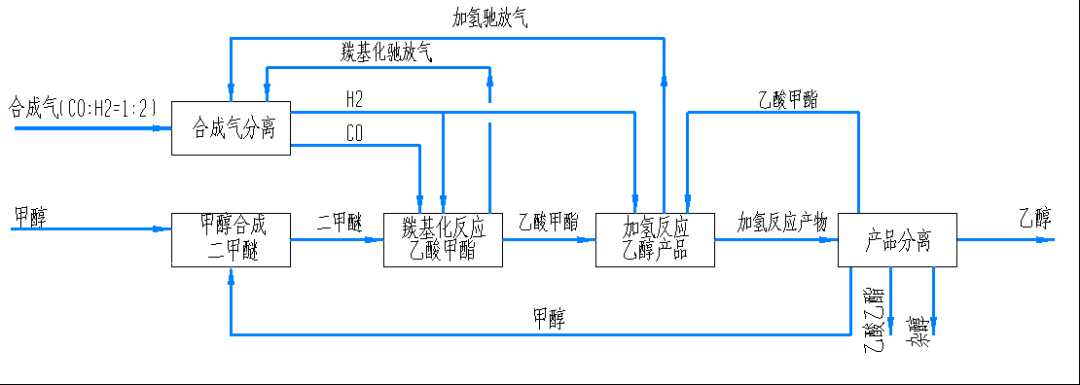 其中DME可來源于合成氣直接合成,也可經(jīng)甲醇脫水得到,分離雜質(zhì)后,二甲醚汽化與CO混合進入羰基化反應(yīng)器,生成乙酸甲酯(MAC),分離雜質(zhì)后乙酸甲酯與氫氣在加氫反應(yīng)器中生成乙醇和甲醇,經(jīng)分離后乙醇作為產(chǎn)品,甲醇返回二甲醚合成單元作為原料又可循環(huán)利用。