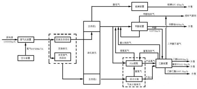 該項目以西灣露天煤礦為原料,采用HT-L煤氣化技術(shù)生產(chǎn)粗煤氣,其中一股粗煤氣進行變換,另一股粗煤氣進行余熱回收利用,再分別經(jīng)過低溫甲醇洗脫除其中的硫和二氧化碳,未經(jīng)變換的煤氣凈化后經(jīng)過深冷分離為H2和CO,經(jīng)變換的煤氣部分送PSA制氫、部分送甲醇合成裝置生產(chǎn)甲醇,CO、H2和甲醇送乙醇裝置。流程示意如圖1。