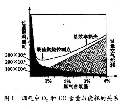 由圖1可見,“過量空氣能耗”表示富余的空氣形成的熱損失,表征為煙氣中的氧含量?!斑^量燃料能耗”表示由未完全燃燒的燃料所引起的能耗,表征為煙氣中CO含量。若要降低能耗,須降低煙氣中的O2含量和CO含量,但兩者是相互制約的。最佳的燃燒控制點的熱損失最小、熱效率最高,其氣體O2含量約為1%。
