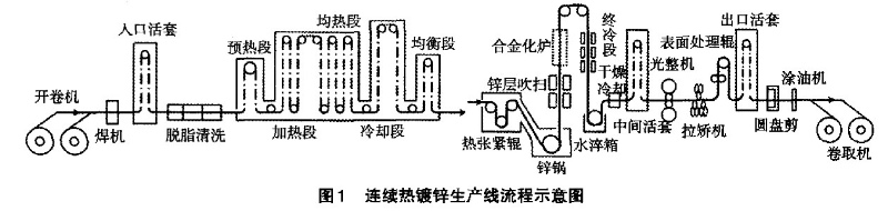 開卷→焊接→脫脂清洗→退火爐→(預熱→加熱→均熱→冷卻→均衡)→熱浸鍍鋅→(合金化爐)→鍍后冷卻→光整→拉矯→表面處理(鈍化/耐指紋)→切邊→在線質量檢測→涂油→卷取。其流程示意圖如圖1所示。