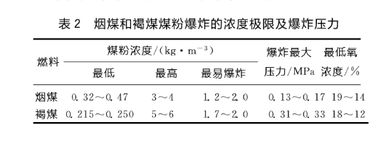 (3)煤粉濃度。煤粉和空氣混合在一定濃度時,由于明火或煤粉沉積物自燃而引起爆炸。煤粉爆炸性隨著它在空氣中的濃度增大而變大,當濃度增加到一定限度時,爆炸性又開始減小。表2列出了煙煤和褐煤煤粉爆炸的濃度極限及爆炸壓力。