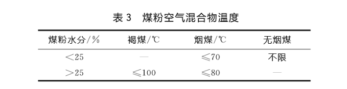 (5)混合物溫度。煤粉空氣混合物溫度越高,爆炸的可能性越大。一般煤粉空氣混合物不宜超過表3中的溫度。