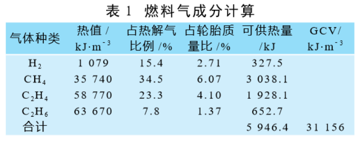 工藝條件不同、廢舊輪胎的差異及計算方式的誤差都可能導(dǎo)致得出裂解氣的GCV不盡相同。在550℃時的熱解氣熱值進(jìn)行計算,氣體量產(chǎn)占輪胎質(zhì)量百分比17.6%,僅計算熱解氣的主要成分H2、CH4、C2H4、C2H6,計算結(jié)果如表1所示。