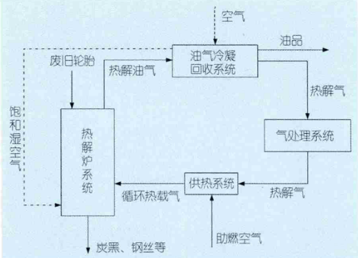 目前處理廢舊輪胎的方法有原型改制、生產(chǎn)再生膠和膠粉、焚燒以及熱解等, 其中熱解技術(shù)一種很具潛力的處理廢舊輪胎的方法。廢舊輪胎熱解技術(shù)是將廢舊輪胎在缺氧或惰性氣體中進(jìn)行熱分解, 可產(chǎn)生熱解氣、熱解油和炭殘渣等。這些產(chǎn)品經(jīng)進(jìn)一步加工處理可轉(zhuǎn)化成具有各種用途的高價值產(chǎn)品。與傳統(tǒng)處理方法相比, 熱解法不僅可以回收高附加值的產(chǎn)物, 而且可以回收近 70%的能源, 具有較高的經(jīng)濟(jì)和環(huán)境效益。