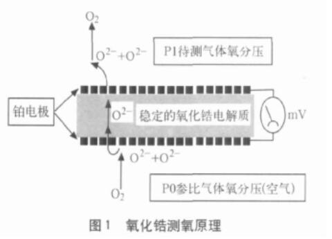 這樣在兩個電極間便產生了一定的電動勢,氧化鋯電解質、Pt電極及兩側不同氧濃度的氣體組成氧探頭即所謂氧化鋯濃差電池。當氧化鋯管處的溫度被加熱到600℃~1400℃時,高濃度側氣體用已知氧濃度的氣體作為參比氣,如能測出氧探頭的輸出電動勢和被測氣體的絕對溫度即可算出被測氣體的氧分壓(濃度),這就是氧化鋯氧探頭的基本檢測原理。