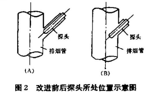 采樣過濾探頭通過套筒裝在專門敷設(shè)的窯尾排煙管上。原設(shè)計(jì)采樣探頭裝在套筒內(nèi),不插入排煙管,如圖2(A)所示。探頭所處位置溫度較低,樣氣水分在探頭周圍凝結(jié),使落在探頭上的粉塵變濕,造成反吹困難,其結(jié)果套管內(nèi)積滿濕粉塵,致使采樣探頭嚴(yán)重堵塞,阻礙系統(tǒng)正常運(yùn)行。為此,將采樣探頭伸入排煙管內(nèi)10cm,如圖2(B)所示。這樣落在探頭上的粉塵會(huì)因高溫氣流作用快速烘干,易被反吹空氣吹落,從而保證了采樣探頭暢通,延長(zhǎng)了探頭使用壽命。