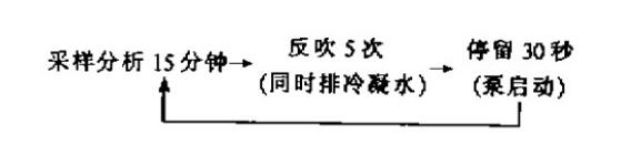 為了適應(yīng)采樣點(diǎn)工作狀況,進(jìn)一步提高分析的可靠性,延長(zhǎng)某些部件使用周期,對(duì)原有執(zhí)行程序進(jìn)行了改編,更合理地安排采樣、排放冷凝水、反吹探頭、停留等各段時(shí)間。在及時(shí)反映煙氣中一氧化碳濃度前提下,適當(dāng)增加反吹次數(shù),以延長(zhǎng)探頭使用壽命。改編后執(zhí)行程序如下∶