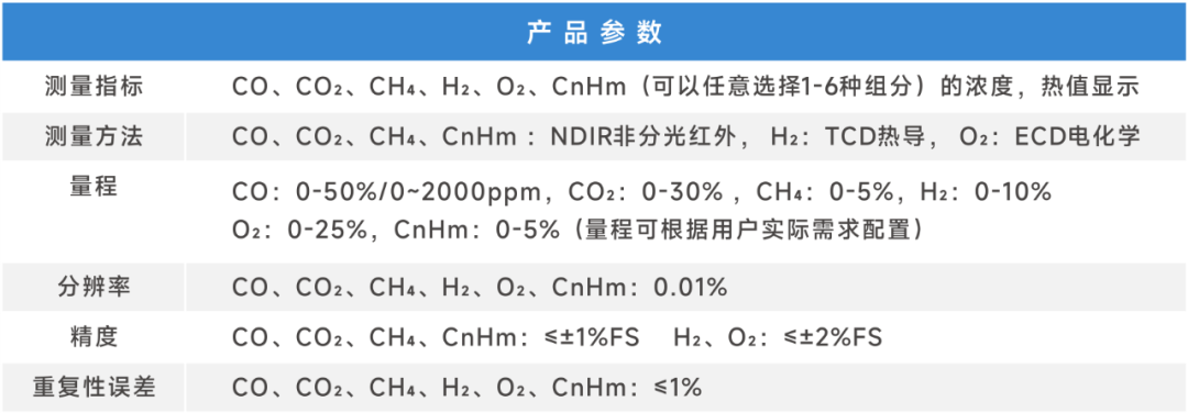 1)儀器測量樣氣中氣體的體積濃度同時輸出熱值,增加超量程限值使能功能,量程范圍內保證測量精度,超量程可測量,提供測量值參考;