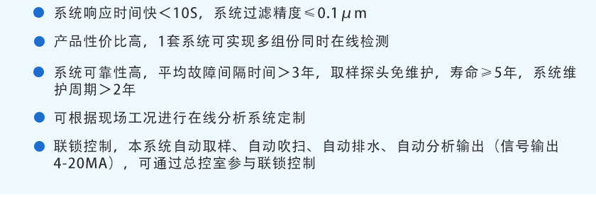 TY-8300型煤氣在線分析系統(tǒng)是天禹智控自主研發(fā)新型在線監(jiān)測系統(tǒng),該產(chǎn)品基于非分光紅外(NDIR)氣體分析技術(shù)、長壽命電化學(xué)傳感技術(shù)以及基于MEMS的熱導(dǎo)技術(shù),可同時(shí)在線測量煤氣的熱值,以及CO、CO2、CH4、H2、O2、CnHm等氣體的體積濃度。預(yù)處理系統(tǒng)采用冷干法設(shè)計(jì),關(guān)鍵部件采用原裝進(jìn)口,可根據(jù)現(xiàn)場不同的工況條件,為客戶定制解決方案,保證分析系統(tǒng)的可靠運(yùn)行。