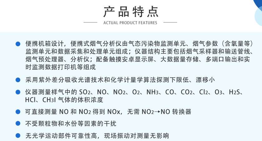 該分析儀基于紫外差分吸收光譜技術(DOAS)、NDIR非分光紅外技術和電化學技術,能夠測量HC、SO2、NO、NO2、CO、CO2、O2等氣體濃度。